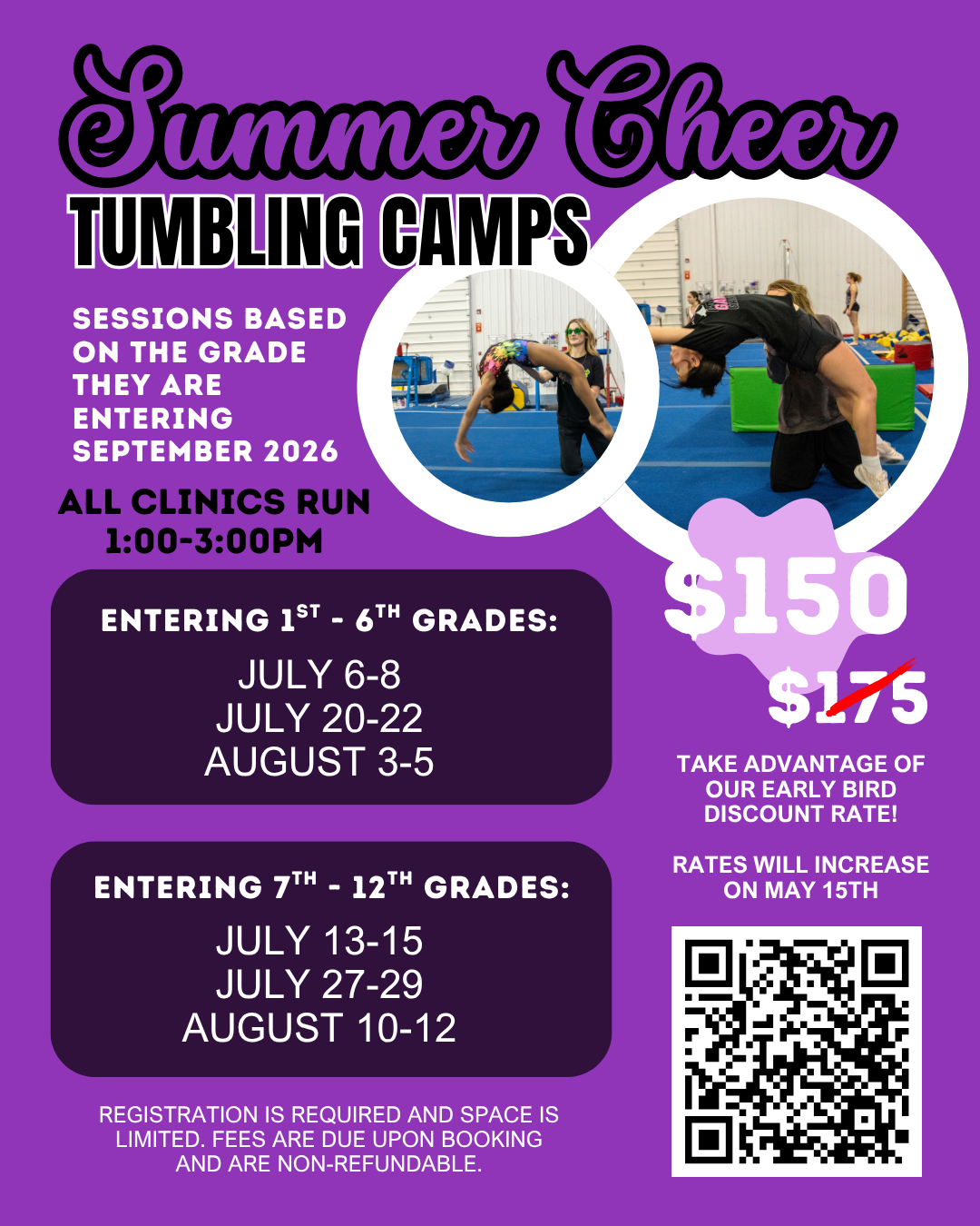 Summer Cheer Tumbling Clinic Entering 1st - 6th Grade July 6-8 July 6-8 July 20-22 July 20-22 Entering 7th - 12th grade August 3-5 August 3-5 July 13-15 July 13-15 July 27-29 July 27-29 August 10-12 August 10-12